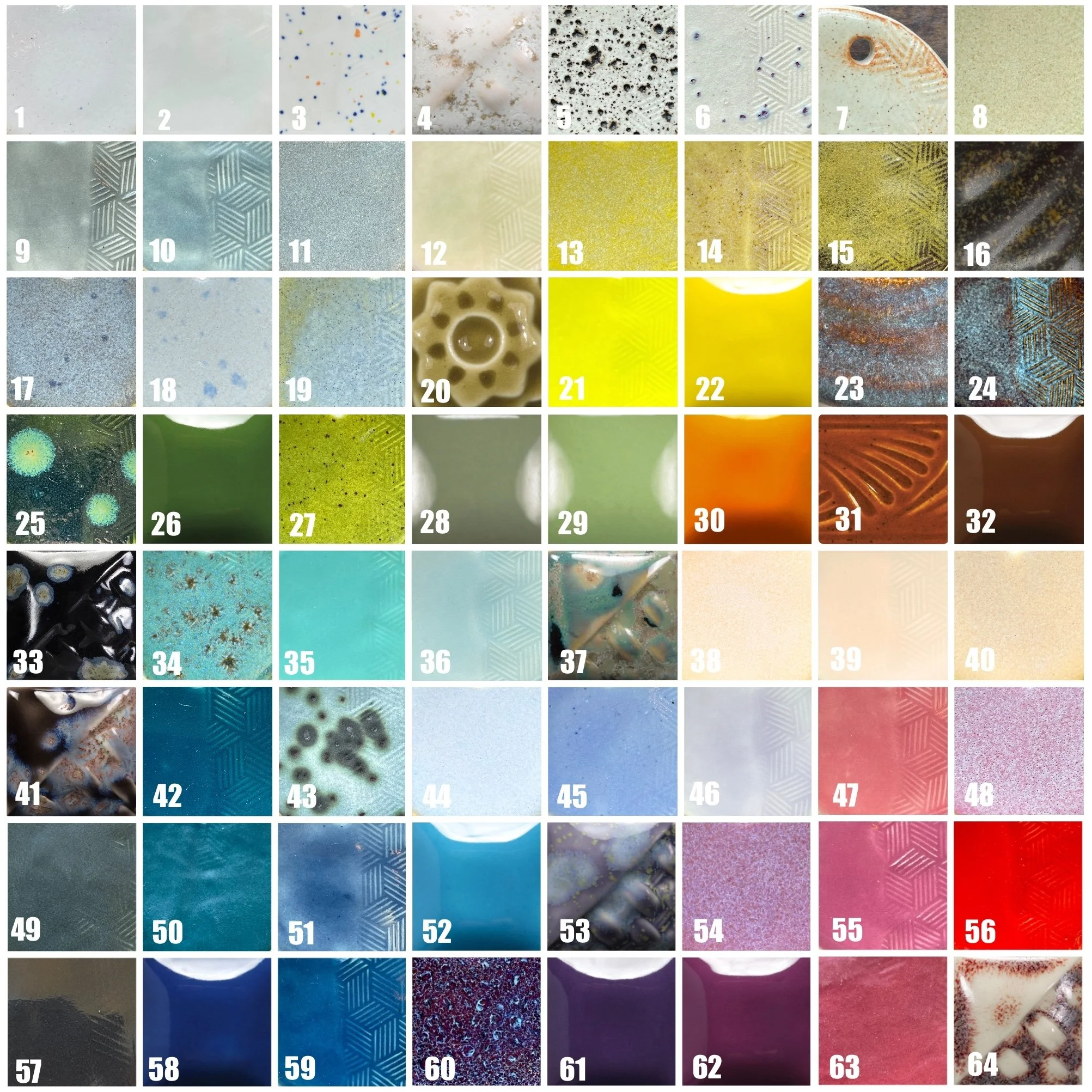 please note that the test tiles in the numbered grid are shown on solid clay — if your pot is going to be made with the speckled clay, dark brown speckles will show through almost all of the glazes. see the photo to the left for an example