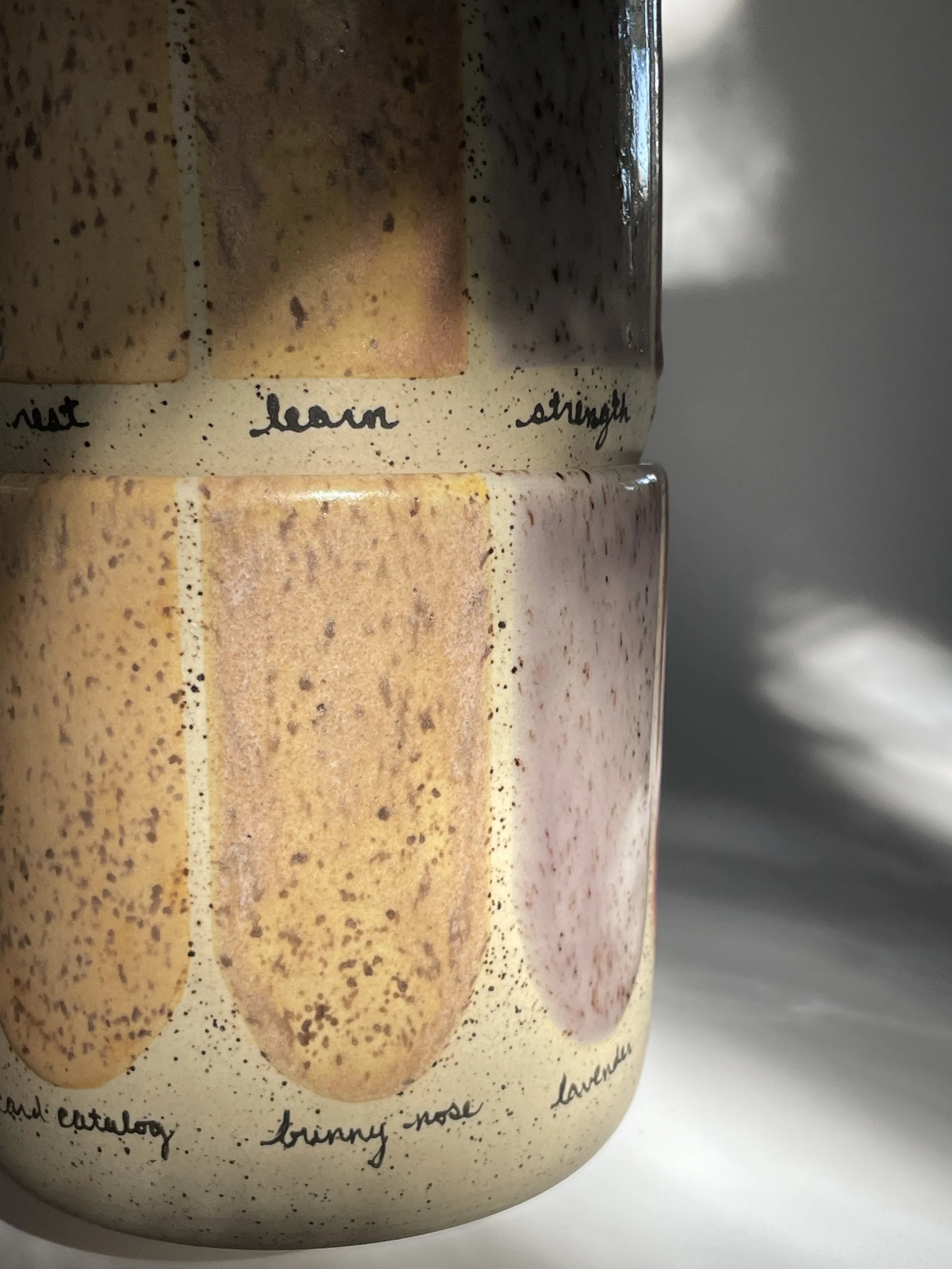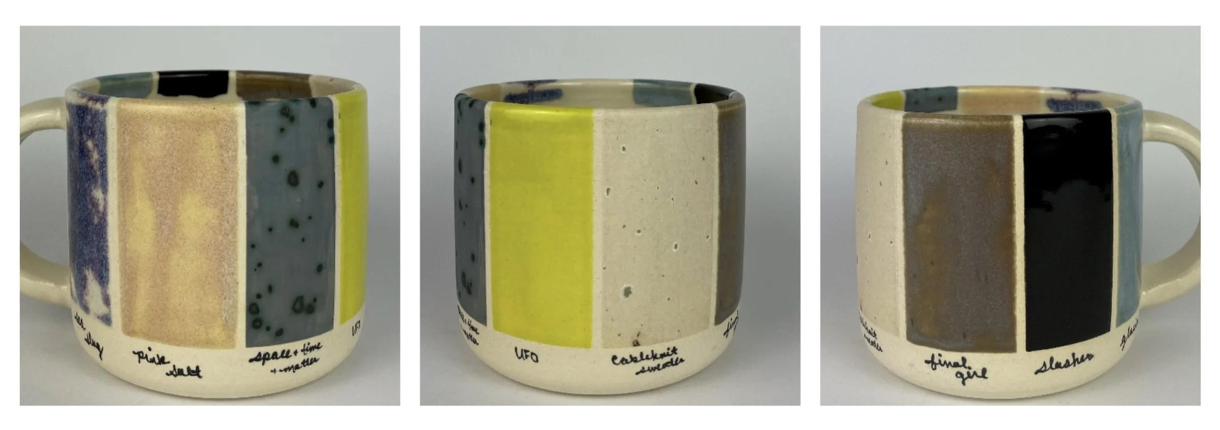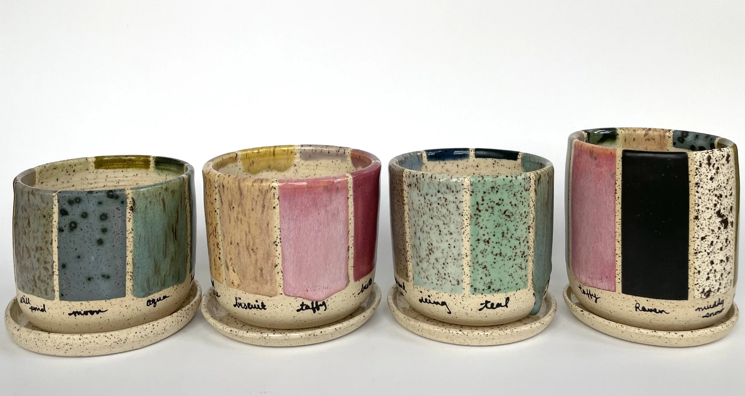 Since some colors can look a little confusing in a zoomed-in photo, I have added quick descriptions and some notes to each glaze below. If you have further questions or want to see more photos of each test tile please reach out! I’ve also added a “closeups and details” section to show more of the glazes.